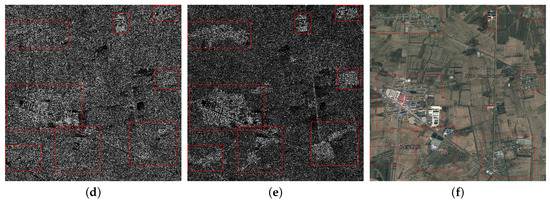 (a) HH; and (b) HV are full polarization GF-3 images of Jilin province (13 July 2017) imaged in SS mode with 25 m resolution covering 83,359.2 square kilometers. Image size is 10,953 × 12,177 pixels. (c) The optical image of the same area obtained from Google Earth. (d–f) Selected areas of (a–c). Areas in red mark are buildings and the rest is cropland.
