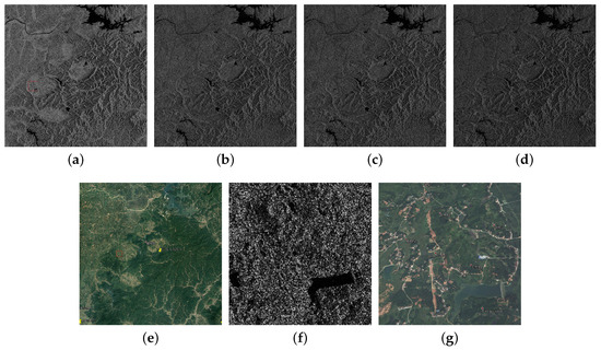 (a) HH; (b) HV; (c) VH; and (d) VV are fully polarimetric GF-3 images of YueYang city in Hunan province (17 August 2017) imaged in QPSI mode with 8 m resolution covering 884.7 square kilometers. Image size is 3859 × 3582 pixels. (e) The optical image of the same area obtained from Google Earth. (f,g) Selected areas of (a,e). Buildings are fused with other classifications.