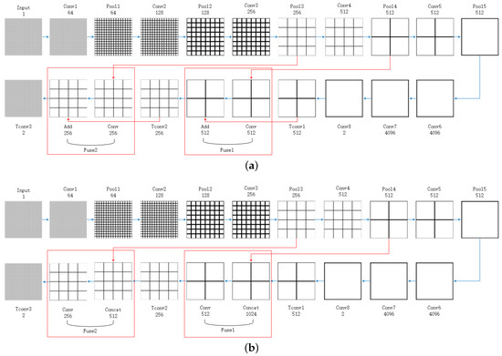 The training processes of the two models: (a) FCN; and (b) FCN16. The number of grids reveals relative spatial coarseness. Convolution numbers of ConvX are given in Table 2. Both models upsample stride 32 predictions back to pixels in three steps. Tconv1 and Tconv2 achieve double upsampling and Tconv3 achieves eight times upsampling. Different structures between the two models are marked with red. The number under layer name is channel number.