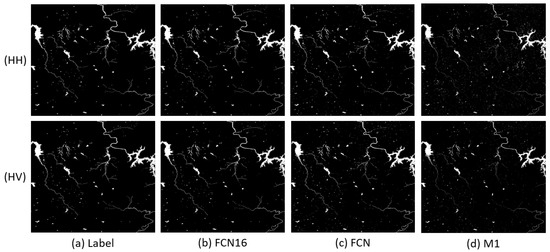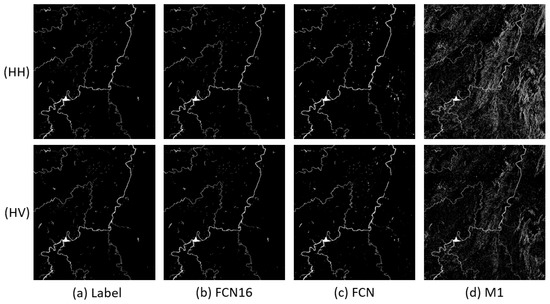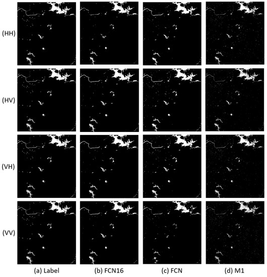 We can see that the FCN16 gives the best results and M1 is the worst, especially in Scene 1. For all methods, performances on HH, HV, and VH are better than the performance on VV. A possible reason is that VV polarization provides less information for the application of flood mapping than other polarizations [4].