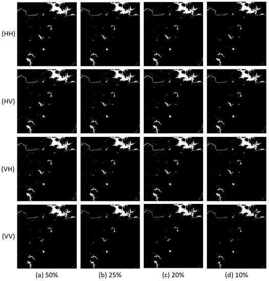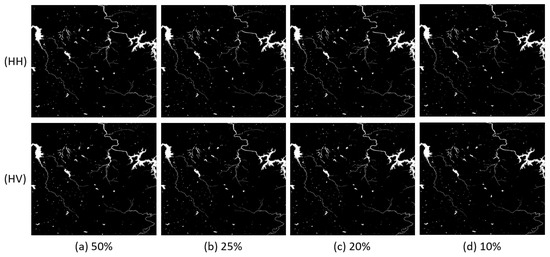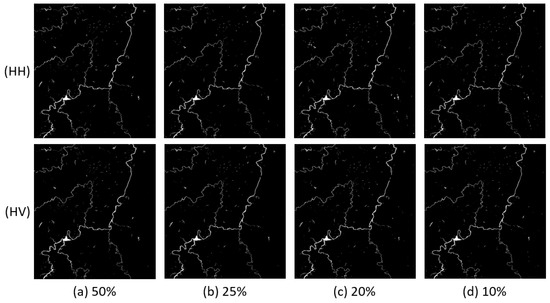 After radiation correction, we need to scale the map to 0:65,535. Due to the existence of speckle noise, directly using linear scaling is not suitable for useful ground scattering coefficients, being compressed to a very small range. In this way, we can only get almost black images. To solve this problem, we set a threshold. values greater than the threshold are set to the threshold. We choose the threshold by ensuring more than 90% of values are lower than the threshold. Although some effective values are abandoned, flood detection is not influenced because flood pixels have low values. The same ground feature has a lower value in cross-polarization than in co-polarization. Thus, we choose the threshold depending on polarization to unify data. After experiments, we found some feasible thresholds, as given in Table 1, with which different polarization images have similar values for same classification. This is useful for model training. Finding the most universal threshold requires analyzing more data and we will do this in future.