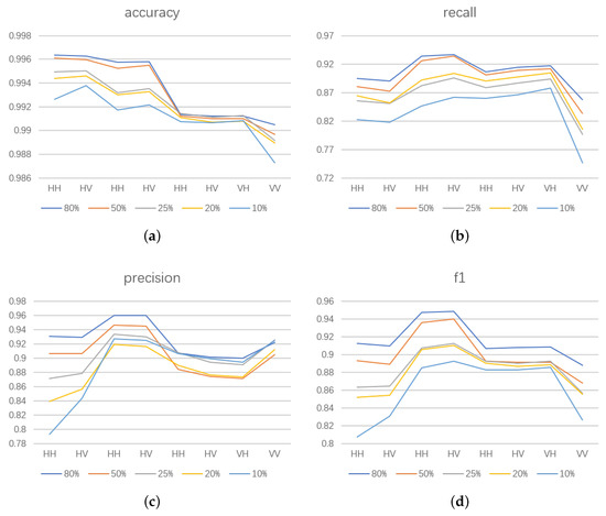 The comparison of four indices under different training set sizes: (a) accuracy; (b) recall; (c) precision; and (d) F1 score. In each figure, the horizontal axis represents different images and the vertical axis represents the corresponding index.