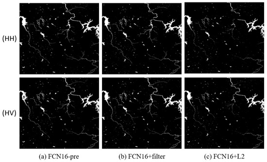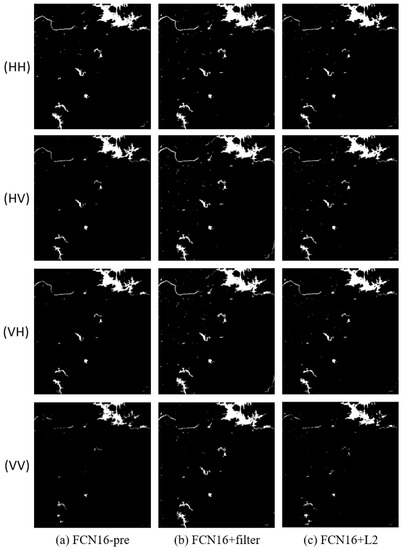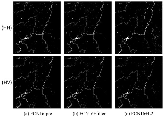 Although recall of FCN16+filter is better than FCN16, this comes at the expense of accuracy. The worse F1 score indicates that this interchange is inadvisable. A possible reason is that filtering leads to the loss of details. Thus, we do not recommend filtering. This contrast experimental result can also be a useful reference for the subsequent segmentation and extraction of SAR image using FCN.