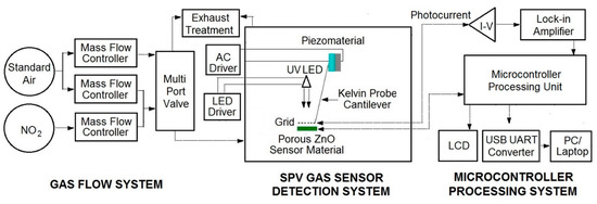 The elaborated surface photovoltage (SPV) gas sensor system consists of three main parts, as shown in Figure 1. Apart from the typical gas flow system containing selected gases, mass flow controllers with multiport valve, it contains the SPV gas sensor detection system combined with microcontroller processing system for data processing and acquisition. The elaborated SPV gas detection system is based on the reverse Kelvin probe flat type vibrating capacitor system. The capacitor subsystem consists of the porous ZnO nanostructured thin films as a flat gas sensor material playing the role of the active electrode, combined with the reference flat Cu metallic grid-type electrode on specific vibrating cantilever after piezoelectric driving using an AC voltage generator.