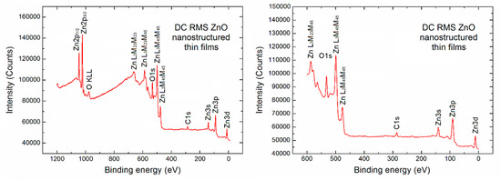 Commonly, basing on the relative intensity (height) of Zn2p, O1s and C1s core level lines and the well-known analytical formula [33,34,35] and the respective atomic sensitivity factors related to the height of the above mentioned Zn2p, O1s and C1s peaks, the relative concentration of the selected elements can be calculated. However, because of the undesired high background in our observed XPS full survey spectrum of 1200 eV binding energy (BE) range with the additional useless Auger electron emission lines, the relative concentration of main elements at the surface of porous ZnO nanostructured thin films has also been estimated on the base of survey spectra in the limited binding energy range (600 eV) (right side in Figure 2).