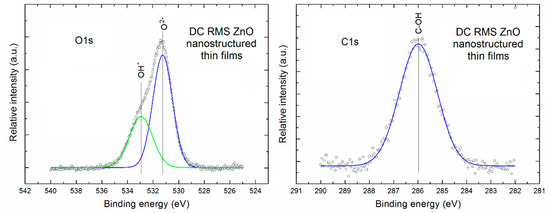 Figure 3 presents the XPS O1s and C1s lines after deconvolution using Gauss fitting (left and right column, respectively) for the porous ZnO nanostructured thin films.