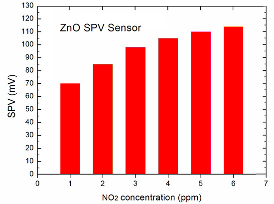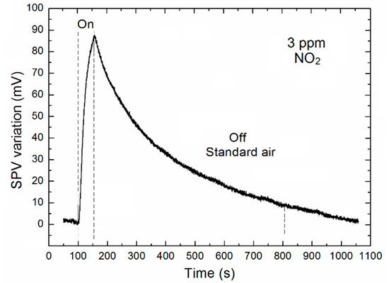 At this point it should be underlined that perhaps our system is able to detect the NO2 gas detection below 1 ppm, since the signal to noise (S/N) ratio was at the level ~50, but our gas flow system (shown in Figure 1) was only able to work in repeatable and reliable measuring condition only up to 1 ppm. Nevertheless, the obtained results look very promising having in mind that our strong SPV signal even at 1 ppm of NO2 was reached already at room temperature working conditions. This performance is not achievable using the common resistive type gas sensor based on various forms of ZnO as gas sensor material [12,13]. Moreover, it should be also underlined that the respective, relative sensitivity is even at room temperature of about 1 order better with respect to the commonly used various forms of ZnO thin films working at higher temperatures, in the range of 200–350 °C [12,13]. It is an important advantage of our sensor prom the point of view of potential applications. As was mentioned above, at the next step of our experiments we have focused on the determination of dynamic characteristics of our SPV gas sensor system including response time and respected recovery time at specific NO2 concentrations.