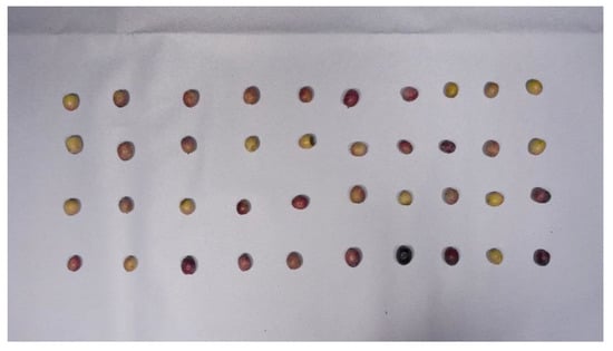 Every described set was photographed in the laboratory, spatially distributing olives over a white plastic mat. This durable and deformable material was chosen in an attempt to approximate the type that would be used in a real conveyor belt. For capturing, the LUMIX DMC-GH4 digital single-lens mirrorless camera, equipped with a NMOS sensor, was used (Panasonic, Kadoma, Osaka, Japan). It was set up in manual mode, with an aperture of f/8, an exposure time of 1/500 s, an ISO value of 400 and a focal length of 14 mm. To reproduce an environment close to an actual industrial system, an artificial lightning setup composed of two 500 W halogen floodlights, with a light appearance of 3300 k, was employed for scene illumination. The camera was perpendicularly located above the scene; the lights were placed at the same plane and oriented to the point the camera was focused on. Figure 1 shows an example of the captured images, which were acquired and saved in JPG format, with pixels in resolution, a pixel density of 180 ppi and a color depth of 24 bits.