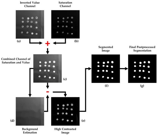 Step by step illustration of the image analysis algorithm on a sub-image of the study set: (a) inverted value channel; (b) saturation channel; (c) combined channel of saturation and value; (d) background estimation; (e) high contrasted image; (f) segmented image; (g) final postprocessed segmentation.