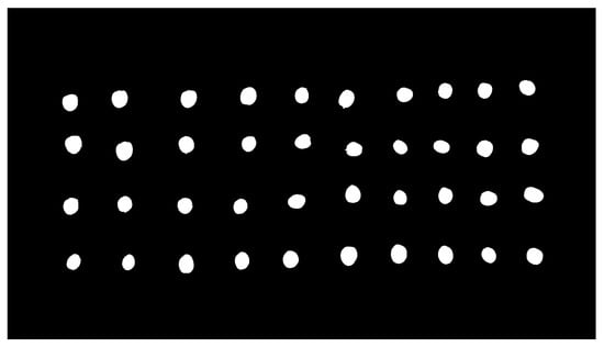 The outcome of this operation, , is the grayscale image to be segmented by binarization. To automatically set an optimum global threshold, the clustering-based method proposed by Otsu [] was selected. This method starts from the premise that the image contains two normal-like distributions of pixels, corresponding to the foreground and the background. Then, the threshold is decided as that which maximizes the inter-class- or minimizes the intra-class-variance to optimize separation. This approach explodes the characteristics of image , which is the result of an image processing aimed at strengthening contrast between the olives and the background, and at homogenizing the latter to favor binarization using a global threshold. Therefore, by applying the Otsu’s method to , the threshold thresh is obtained and applied to undertake its binarization as: