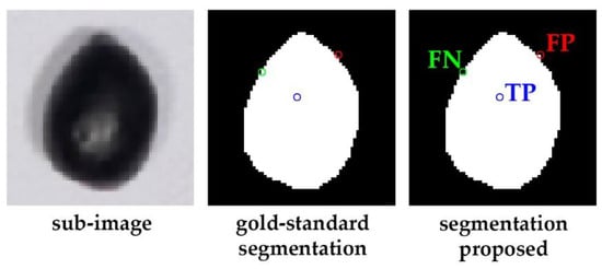 Every segmented image obtained with the proposed methodology is compared to a corresponding reference image at a pixel level to evaluate its quality. To enable this comparison, a ground-truth image was generated per each image-set considered in the experiment (A1–A5 and P1–P4) by manually labeling pixels using a graphic editor (concretely Photoshop CC V 14.0, Adobe Systems Incorporated, San Jose-California, EEUU); olive and background pixel values were set to 255 and 0, respectively. Then, results of pixel comparisons are categorized and annotated according to the following definitions (see Figure 4 to check each case):