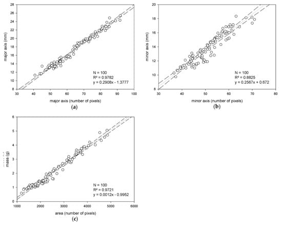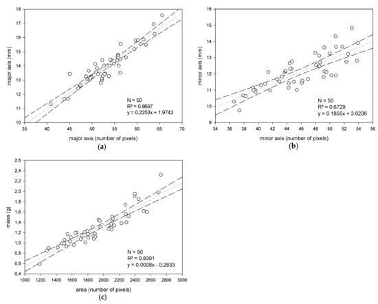 Once this information is extracted, for each of the two considered varieties, a population of 50 individuals/olives is selected as the training set; the remaining 150 individuals are kept for external validation. These training sets are representative of the variability of the samples regarding the features under study. Next, the measurements of the major and minor axis length, and mass, corresponding to these populations and extracted automatically as specified above from the segmented images, are compared to the objective measurements taken in the laboratory. Thus, via regression analysis, linear estimation models for the targeted magnitudes and specific to each variety are yielded. Additionally, variety independent models for the magnitudes are also calculated by joining the two training sets from the two varieties and applying the same described procedure.