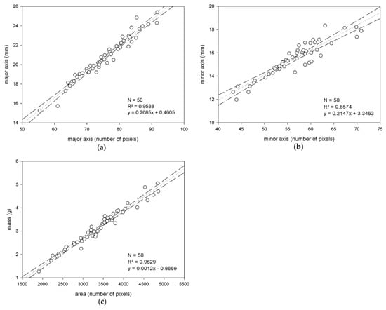 Regarding the estimation of the major and minor axis, and mass of olives, accurate results were measured, which do not indicate the necessity of exploring non-linear modeling to this effect. Especially remarkable is the analyzed behavior of the variety-independent models, which showed comparable, or even better, performance than specific models. This outcome supports their use in the pursuit of applicability and generalization. Notwithstanding this, future investigations will pursue the verification of this conclusion with studies that include samples from more varieties. Moreover, further and wider investigations will also be conducted to more confidently quantify the impact of pixel weighing linearization for mass estimation.