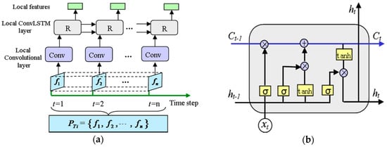 Local spatiotemporal feature extractor: (a) Structure of the local spatiotemporal feature extractor; (b) Diagram of the recurrent cell in ConvLSTM.
