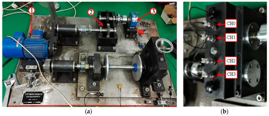 Gearbox test rig: (a) Main units: (1) Motor (2) Parallel gearbox (3) Magnetic powder brake (b) Locations of sensors.