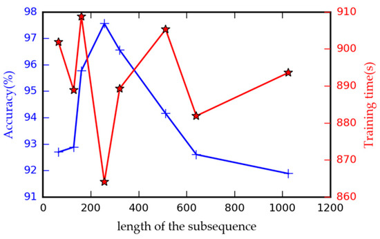 Accuracy and training time under different length of the subsequence.