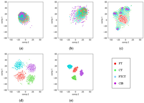As we know, deep learning models work like a black box, so it is hard to understand its process of extracting features. In this section, the t-SNE method [44] is used to show the features extracted by each layer in our proposed TDConvLSTM model. T-SNE is an effective dimensionality reduction method, which can help us to visualize high-dimensional data by mapping the data from high-dimensional space to a two-dimensional space. Features extracted by each layer are respectively converted to a two-dimensional feature map. The feature maps of raw data, the local convolutional layer, the local ConvLSTM layer, the holistic ConvLSTM layer and the FC layer are shown in Figure 8, in which features of different fault types are distinguished by different colors. It can be seen that as the layers get deeper and deeper, the features of different fault types become more and more separate. As shown in the Figure 8a, raw data of four fault types are all mix together. Then the local convolutional layer disperses all features, which is shown in Figure 8b. Starting from the local ConvLSTM layer, the features of the same fault type begin to cluster. In the Figure 8c, we can see that the FT type and the CIB type start clustering first, while the CT type and FTCT type are still mix together. It is because that both the CT type and FTCT type have a root crack tooth in the big gear, so they have some same features. As we can see in Figure 8d, after the local ConvLSTM layer, the features of four fault types are almost separated. At last, the FC layer further separates the features of the four fault types and further clusters the features of the same fault type.