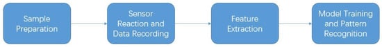 The equipment used was an electronic nose system from the State Key Laboratory of Industrial Control Technology in Zhejiang University [31,37,38], which contains 16 TGS (Taguchi Gas Sensors) type metal oxide semi-conductive (MOS) sensors bought from Figaro Engineering Inc. (Osaka, Japan). TGS sensors have already shown robust performances in food classification [39,40]. Each sensor in this sensor panel fixed on a circuit in a 200 mL chamber has respective affinity while reacting with certain gases and the features are listed in Table 1. The sensors selected can respond to the volatile gas compounds emanated by different types of herbal medicines which includes many different types of phenols and aldehydes. Meanwhile, these sensors do not have excessive specificity towards one type of gas which is appropriate for herbal medicine odors which have complicated compositions. A heater voltage of 5 V was supplied to each sensor to ensure better performance in accordance with the recommendations from Figaro Engineering Inc. A brief layout of the system is shown in Figure 3.