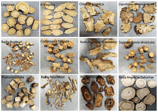 Based on research, our group selected 12 different categories of traditional Chinese herbal medicines for experiments (including Astragalus, Liquorice, Chinese Angelica, Saposhnikovia Divaricata, Radix Angelicae Pubescentis, Radix Angelicae Dahuricae, Notopterygium Incisum, Codonopsis Pilosula, Radix Bupleuri, Ligusticum Chuanxiong Hort, Radix Peucedani, and Pueraria Lobata). These herbal medicines mainly come from the Umbelliferae Apiaceae family. In addition, all the medicines are derived from the root parts of each category. The criteria of our selection were the similarities between their appearances and biological classifications, and the misleading and substituting phenomena that appear in the market. The physical appearances of the medicines are shown in Figure 2.