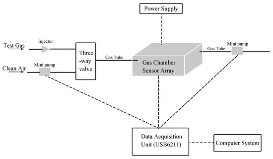 The gas transporting system consisted of a three-way valve and two gas pumps to alter between the flow of target gas and the flow of standard gas (clean and dry air). Meanwhile, the pump system ensured that the flow of gas was 1 L per minute. With regard to the signal recording system, a data acquisition (DAQ) unit USB 6211 manufactured by National Instrument (Austin, TX, USA) was bought to record the responses of sensors and the control signals of valves and pumps using a software based on Labview 2014.