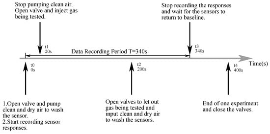 We used the electronic nose system to analyze all 600 samples, one by one. The environment temperature was 22–27 C and the relative humidity in the laboratory during experiments was 50–70% and the environment conditions were relatively stable during experiments. The overall process of the experiment for one single sample is shown in Figure 4. Each individual test lasted for 400 s in total and the sampling frequency was set to be 100 Hz. Firstly, sensor panels were cleaned with 1 L/min standard gas to return to the baselines for 20 s. Secondly, target gas was filled into the chamber and the flow of standard gas was stopped. We used medical injectors to extract 10 mL gas mixtures in the head-space of each sample and injected the gas into the chamber where the sensor panel was located. The injection of target gas was less than 1 s and the gas was injected as soon as possible. Afterwards, a period of 180 s was set for the reaction which was regarded as the “rising and stabilizing” period, after which the standard gas was pumped in again and the pump letting gas out was also opened. The recording process lasted for another 140 s after the system entered the “declining” period. Finally, the sensors were stabilized for another 60 s.