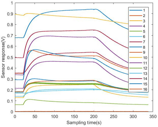 Typical sensor response curves are shown in Figure 5; these indicate the responses to the sixth Astragalus sample. Firstly, all the data from the sensor signals were calibrated by subtracting the baselines to eliminate sensor drifts: