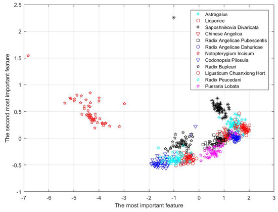 Meanwhile, with PCA, we can depict the distribution of samples by lowering the number of dimensions to 2D, as is shown in Figure 6. From this figure, we can see that, visually, it is possible for different kinds of herbal medicines to be classified even if we condense the features into a 2D space.