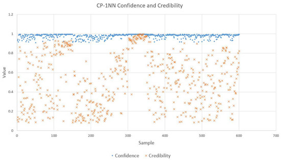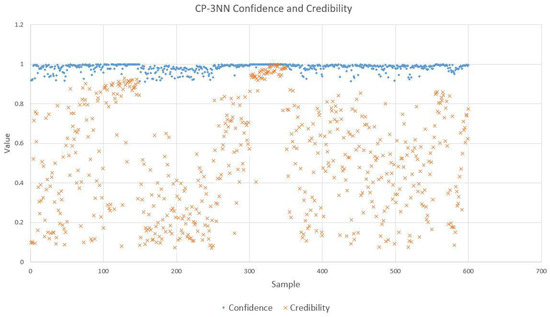 For conformal predictors, predictions are not the only products. What is also significant is the reliability information, which is given as confidence and credibility. We randomly selected 5 samples from a total of 600 samples which used CP-1NN for analysis to serve as examples, as is shown in Table 7. According to this table, CP-1NN gave correct labels for the samples with indices of 5, 233, and 512, and the confidence values associated with them were approximately 1, while their respective credibility levels did not approximate 0, which manifests the high prediction reliability. On the contrary, CP-1NN erroneously predicted the labels for sample 384 and sample 478. These two predictions have high confidence but low credibility, which justifies the wrong outputs of CP-1NN. After analyzing these five examples, we depicted the confidence and credibility levels of all 600 predictions with CP-1NN and CP-3NN, as shown in Figure 7 (CP-1NN) and Figure 8 (CP-3NN). We can see that nearly all predictions tend to feature high confidence but credibility values vary with diverse samples. Through comparing CP-1NN and CP-3NN, we found that predictions given by CP-3NN showed higher confidence values but lower credibility levels. A possible reason for this may be that with the addition of new neighbors for nonconformity measurement, confidence can be boosted with more information about the sample space. Meanwhile, when a larger number of neighbors is taken into consideration, the model can be more complicated and the requirement for conformity of each single feature–label combination depends not on one sample but three samples which may cause the credibility to suffer.