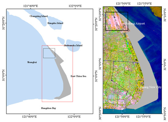 The left image is the location of the study area. The red rectangle is the study area, and the black rectangle is Pudong International Airport. The gray polygon is the area reclaimed from 2002 to the present. The right image is the map of the study area. The background image is a Sentinel2 false color image (the acquisition sate was 28 February 2017; the red channel is the 11th band; the green channel is the 8th band; the blue channel is the 2nd band; the spatial resolution is 10 m × 10 m).