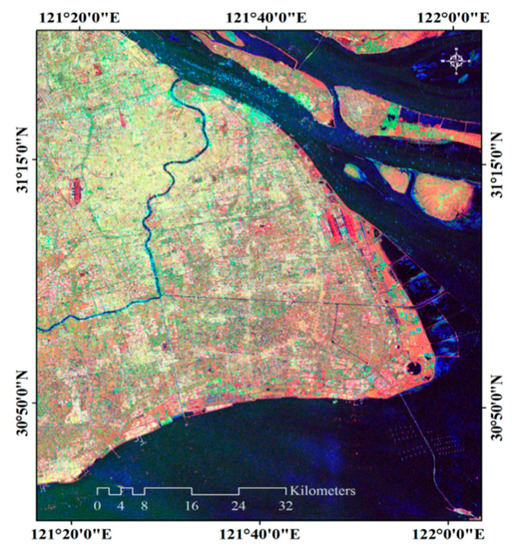 Shanghai coherence false color image (the acquisition dates are 27 February 2017 and 11 March 2017, respectively). The red channel is coherence. The green channel is mean backscattering intensity. The blue channel is backscattering intensity difference. The spatial resolution is 30 m × 30 m).