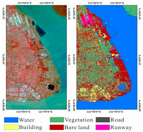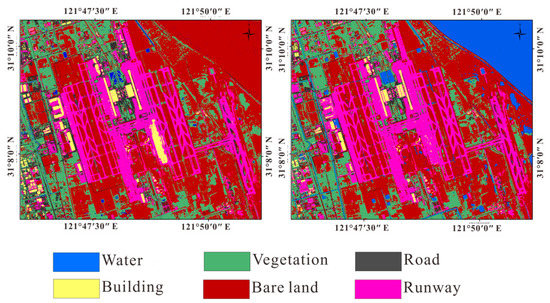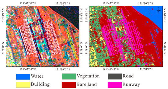The left image shows the coherence false color image of Pudong International Airport (The acquisition and channel is same as Figure 2. The right image is the classification result of the coherence false color images.