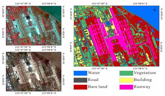 The top left is the standard false color composite image of Pudong International Airport (the acquisition date is 28 February 2017). The red channel is the 8th band. The green channel is the 4th band. The blue channel is the 3rd band. The spatial resolution is 10 m × 10 m. The bottom left is a true color image (the acquisition date is 28 February 2017). The red channel is the 4th band. The green channel is the 3rd band. The blue channel is the 2rd band. The spatial resolution is 10 m × 10 m. The right side is the result of visual interpretation (the spatial resolution is 10 m × 10 m).