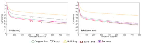 The left is the relationship between temporal baseline and coherence of different land cover types in the stable area. The right is in the subsidence area.