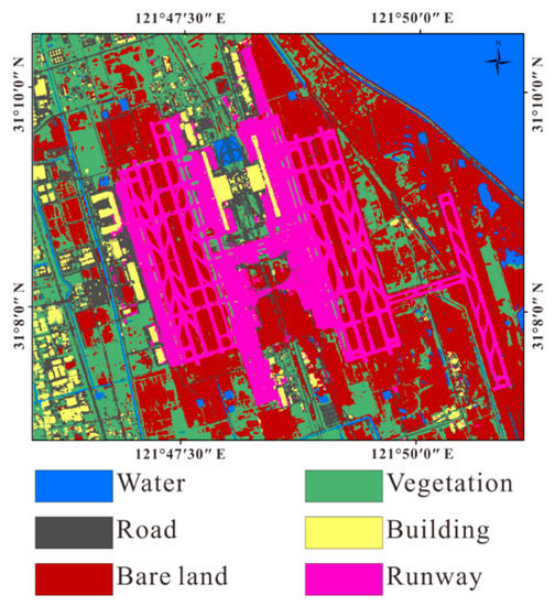 It is noteworthy that we found that at the Pudong International Airport, the R5 runway showed completely different colors from other runways. The R5 runway is located in the reclamation area. We select the Support Vector Machine (SVM) algorithm to classify the coherence false color images. The SVM, first proposed by Vapnik in 1995 [40], is a common identification algorithm. Many previous studies have demonstrated that the SVM algorithm has higher classification accuracy than traditional statistical and neural network algorithms. Salehi et al. found that the classification of the SVM algorithm is better than that of the multi-layer perceptive neural network [14]. Zhang et al. found in the study that the SVM algorithm is superior to Fuzzy C-Means and multi-layer perceptive neural network methods both training speed and image classification accuracy [41]. Based on MATLAB, we wrote SVM code to supervised classification. We selected the RBF kernel function, and get the optimal kernel function parameter width g = 0.5 and the penalty coefficient c = 128 by using grid search method. From the classification results (Figure 3), we can see that the R5 runway was misclassified into the water, which is an unexpected error that should not appear in any research.