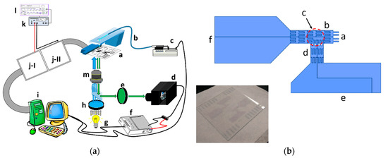 (a) the schematic illustration of coplanar electro-wetting based microfluidic sorter. a. electro-wetting-on-dielectrics (EWOD) chip; b. sample delivery capillary; c. syringe pump; d. photomultiplier tube; e. bandpass filter (532 nm); f. digital input/ output interface card (NI 9215 DAQ); g. mercury lamp; h. bandpass filter (488 nm); i. personal computer with digital input/ output interface card (NI 6509 DAQ); j. relay array units I and II; k. high voltage amplifier; l. function generator; m. microscope objective (10X); and, (b) the schematic illustration of EWOD chip layout. a. sample droplet entrance; b. inlet channel; c. detection zone; d. collection channel; e. droplet collection zone; f. droplet waster zone. The imbedded image at the lower left corner is one photograph showing two sets of this EWOD device printed on one slide.