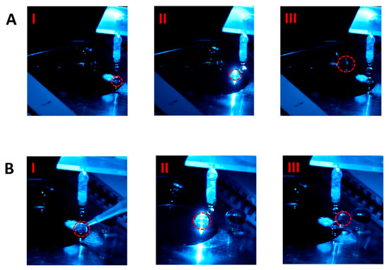 One the other hand, in Figure 3B, because the fluorescence particles were added into the droplet dripped at the channel entrance (the snapshot I), when the droplet was driven into the detection zone, the intense fluorescence signal clearly appeared upon the incident light illumination through the microscope lens (snapshot II). The EWOD electrodes were therefore actuated to divert the droplet vertically into the other channel when the fluorescence signal was received to trigger the electrode control circuit. The diverted droplet was finally dragged to the collection zone (snapshot III).