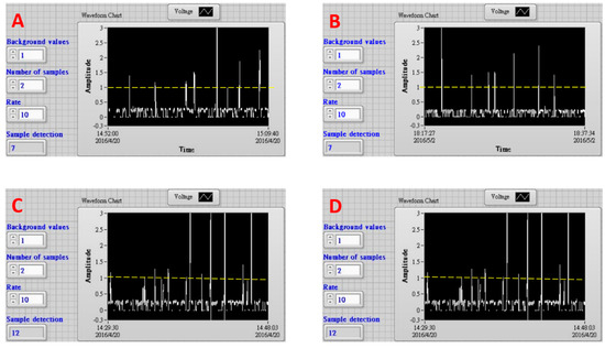 Temporal fluorescence signal traces during droplet sorting processes using EWOD device. Frame (A): sample aliquot containing about 10 fluorescent microspheres (1000 μL); Frame (B): the same sample solution as that in A of 1200 μL aliquot; Frame (C): sample aliquot containing about 25 fluorescent microspheres (1200 μL); Frame (D). the same sample solution as that in C of 400 μL aliquot. The dashed lines in each frame are the cut-off level to actuate the EWOD electrode sets to divert the droplets.