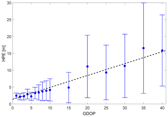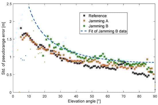 , while the positioning accuracy heavily degraded. It appears that jamming merely introduces additional noise in the measured pseudoranges, while the positioning degradation occurs under powerful interference due to the loss of satellite signal track and a consequent poor satellite geometry.