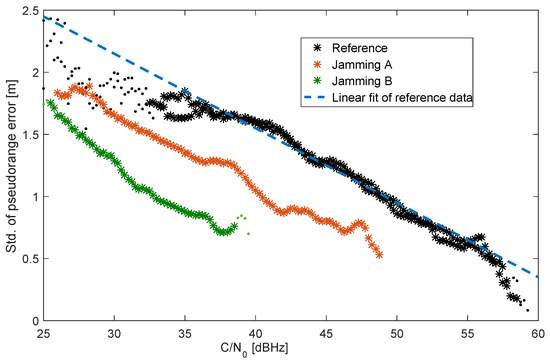 16], a performance test of such a multi-sensor system under real jamming conditions on a vessel is still missing. Typically, the GNSS outage is only emulated by switching the GNSS signals off instantaneously, whereas within a real jamming scenario a complete GNSS outage is only the final stage after a slow degradation of GNSS signal reception. The crucial point is the correct description of the GNSS measurement error statistics under jamming conditions. Whenever the GNSS noise model assumptions are violated, the Kalman filter (KF) could behave suboptimally and therefore could result in inferior performance compared to that which is often demonstrated using pure simulated data. Typically, it is expected that the jamming leads to an increased range noise and might even result in failures in signal tracking loops. Therefore, the characterization of GNSS pseudorange errors statistics under jamming conditions is a prerequisite of using an IMU/DVL/GNSS integration in a real jamming scenario.