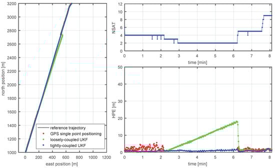 Note that at least four satellites have to be visible in order to solve explicitly for both the position and the velocity in loosely coupled architecture. If there are fewer than four satellites visible at a given epoch, no solution can be found and the GNSS measurement step of the loosely coupled filter has to be skipped. An alternative approach, also known as