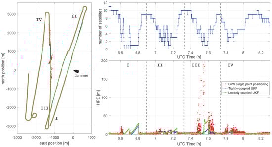 31], the performance of the navigation solution fusing IMU, GNSS, and DVL was demonstrated on a maritime scenario. However, the performance characterization under actual GNSS jamming conditions has not yet been realized.