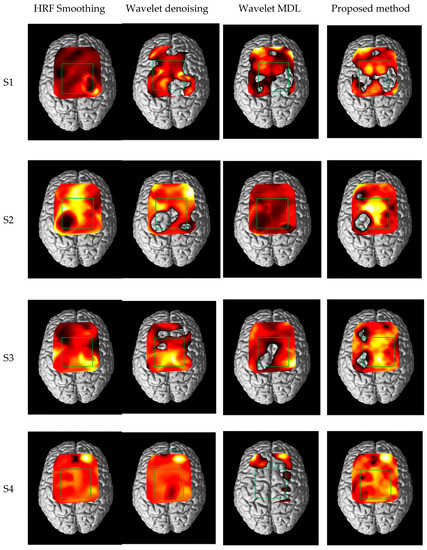 Figure 12 shows one of the brain activation mapping results and the green box in Figure 12 presents the region of interest (ROI), which is related to the SMA (supplementary motor area) and M1 (primary motor cortex); in addition, ROI channels were determined (CH 7, 11, 12, 16, 20, 21, and 25). The ROI is decided based on previous fMRI, fNIRS and EEG studies [36,37,38,39]. As can be seen in Figure 12, the patterns of the brain activation are present in the similar region for each subject. Wavelet MDL tends to show quite different patterns because of the signal distortion, and HRF smoothing and wavelet denoising show similar activation maps. The brain activation of the proposed method shows stronger activation than other algorithms in ROI and it also presents symmetric activation. The result shows the proposed method has a feature-enhancing fNIRS signal and keep hemodynamic response of the brain cortex.