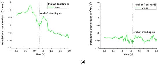For step No. 10, the appropriate way for nurses is to squat down and lower their waist before assisting the patient to stand up. The incorrect way is standing up straight without lowering the waist. The difference in influence on the patient happens during the standing up at step No. 11. According to the results of Figure 7 and Table 2, when Teacher A did not lower his waist and then supported the patient to stand up, the peak-to-valley of translational acceleration increased from 5.53 × 103 m/s2 to 6.58 × 103 m/s2. However, for the trial of teacher B, the peak-to-valley of acceleration decreased from 2.59 × 103 m/s2 to 1.57 × 103 m/s2. Such inconsistent results on correct/incorrect ways were obtained and discussed in the following session. Hereafter, the peak-to-valley amplitude is considered as the change between the peak (highest value) and valley (lowest value, which can be negative), and value of peak/valley during the movement of standing up or sitting down.
