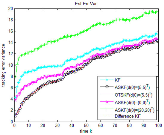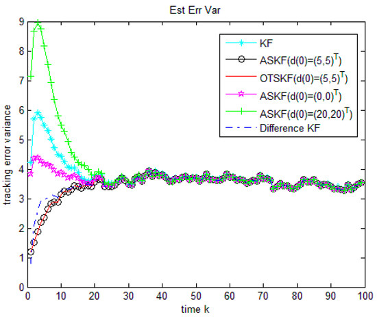 It must be noticed that Difference KF uses to estimate at step . However, the KF, ASKF and OTSKF only use to estimate at step . To make an equal comparison, in Difference KF with in the other five algorithms is compared. As , is almost equal to a random white noise with small covariance after several steps and the influence of the initial value will be gradually weakened. The tracking errors of the six methods are compared in Figure 1 and Table 2. It can be noticed that no matter whether the initial values of the unknown input in ASKF and OTSKF are accurate or wrong, the tracking results of the six algorithms are almost the same after about 25 steps. However, it should be noticed that the Difference KF performs better than the ASKF with inaccurate initial value of unknown measurement in the first stage, which is important for some practical conditions, for instance, in multi-target tracking problems, due to data association errors and heavy clutters, tracking has to restart very often. Therefore, in order to derive an entirely good tracking, initial work status at each tracking restarting should be as good as possible.