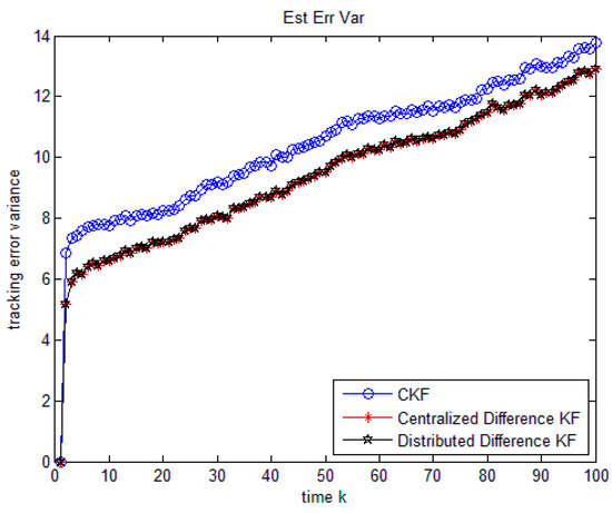 The initial states of the three algorithms are set at , the initial . Using 100 Monte-Carlo runs, we can evaluate estimation performance of an algorithm by estimating the second moment of the tracking error.