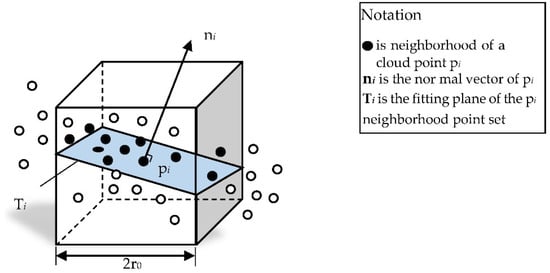 The scanning point cloud usually has defects, e.g., due to external noise, pre-processing was needed before subsequent processing. The point cloud processing required neighborhood information of the point cloud []. Figure 1 shows the neighborhood of a cloud point pi and the corresponding normal vector and fitting plane. The neighborhood searching methods were well studied and we refer readers to Reference [] for the details. The octree structure [] was used to speed up the neighborhood search, as shown in Figure 2. In order to improve the efficiency, the octree building and even neighborhood point search were completed when the point cloud was imported. Search the neighborhood to synthesize different types of surfaces and perform denoising according to the point cloud requirements.