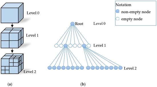 Octree. (a) Space decomposition, (b) Octree hierarchical structure.