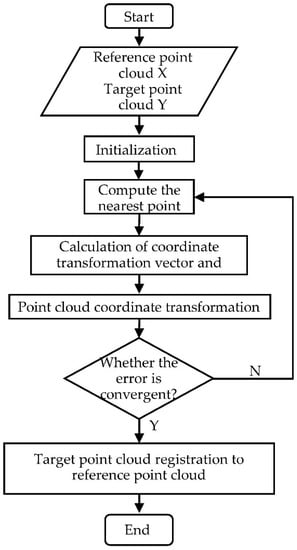 In the scanning process of the Terra-Cotta Warriors, the point cloud data obtained by the scanner may have translation dislocation and rotation dislocation. In order to obtain accurate and complete point cloud data, registration of the obtained local point cloud data was needed. In this work, the ICP (Iterative Closest Point) algorithm [,] was used to make it repeat the process of determining the set of corresponding relation points and calculating the optimal convergence, until a convergence criterion for the correct matching was satisfied so that it is converted to a unified coordinate system. Its principle flowchart is shown in Figure 3.