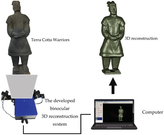 A three-dimensional measurement and reconstruction system for cultural relics was developed in our lab, including both software and hardware. The developed binocular 3D reconstruction system is shown in Figure 4, where an LG (HX300G) projector with a resolution of 1024 × 768 was used to cast three frequency cosine white stripes and the three cosine photoperiods were 1008 pixels, 144 pixels, and 16 pixels, respectively. The light source of the projector was non-interference light with a wavelength of 450–465 nm. The industrial camera RS-A1300-GM60 (manufactured by the Beijing Microview Science and Technology Co. Ltd., Beijing, China) sent a 1280 × 1024 gray image to the computer at a frame rate of 4 frames/s. The industrial camera used an 8 mm (M0814-MP2) lens. The system was about 500 mm away from the Terra Cotta Warrior and the angle between the two cameras was about 60°. The binocular 3D reconstruction system used two grayscale cameras, i.e., the grayscale image was captured through a single channel. The R, G, B trichromatic light was projected in order and the actual color of the measured object was obtained through color difference synthesis of the three colors. In this way, color point cloud data were obtained and the processing speed was also faster compared to the processing of three channel color images, which also helped to reduce the cost to some extent.
