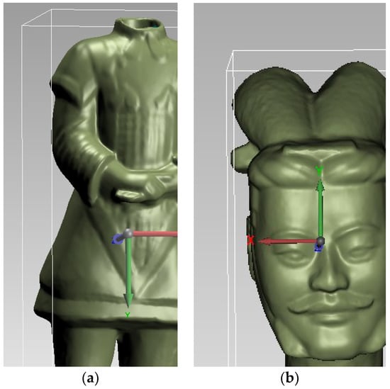 The Terra-Cotta Warriors were divided into head and body parts, which are disassembled during transportation. The scene personnel provided the size of the Terra-Cotta Warriors as follows: The actual length of the body part is 40 cm; the width is 39.6 cm; the height is 94.4 cm; the actual length of the head is 27.1 cm; the width is 29 cm; and the height is 17.2 cm, which are listed in Table 3. Table 4 compares the measurements and the actual size of the Terra-Cotta Warriors. We measured the distance between any two features of the Terra-Cotta Warriors by Geomagic studio and compared them to the actual value. For example, the distance between the corners of the two eyes, the distance between the two corners of the mouth and the distance between the two feet, which are listed in Table 5. The experimental results show that the accuracy of the system for measuring large objects is about 0.1 mm (due to the post-processing of point clouds), which meets the packaging requirements of cultural relics to effectively protect the cultural relics during transportation.